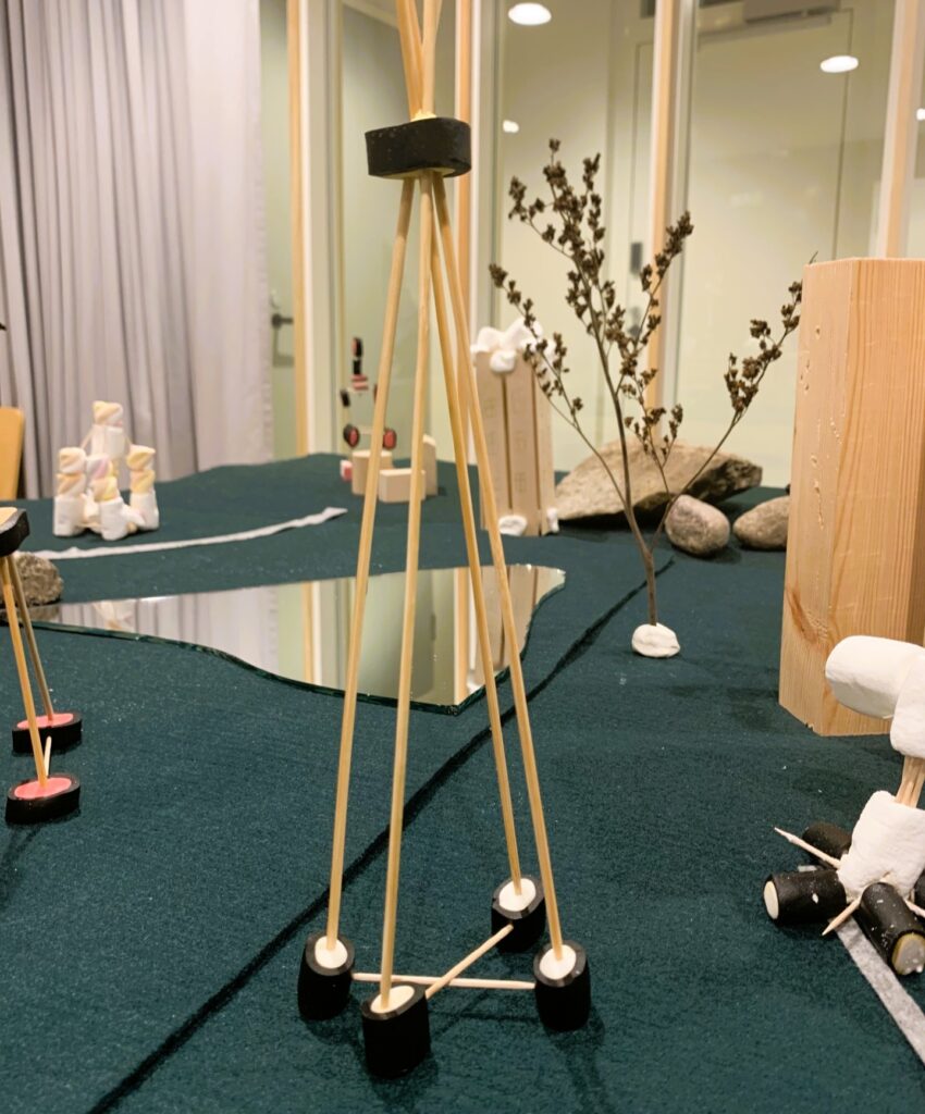 With the help of a space bridge, you can travel to another place. Let’s imagine and build a new kind of world! Let’s build space dwellings or ships, satellites, and space bridges in a new shared landscape. Let’s experiment and play with forms and structures! Space constructions are made from candies and various types of wood materials.